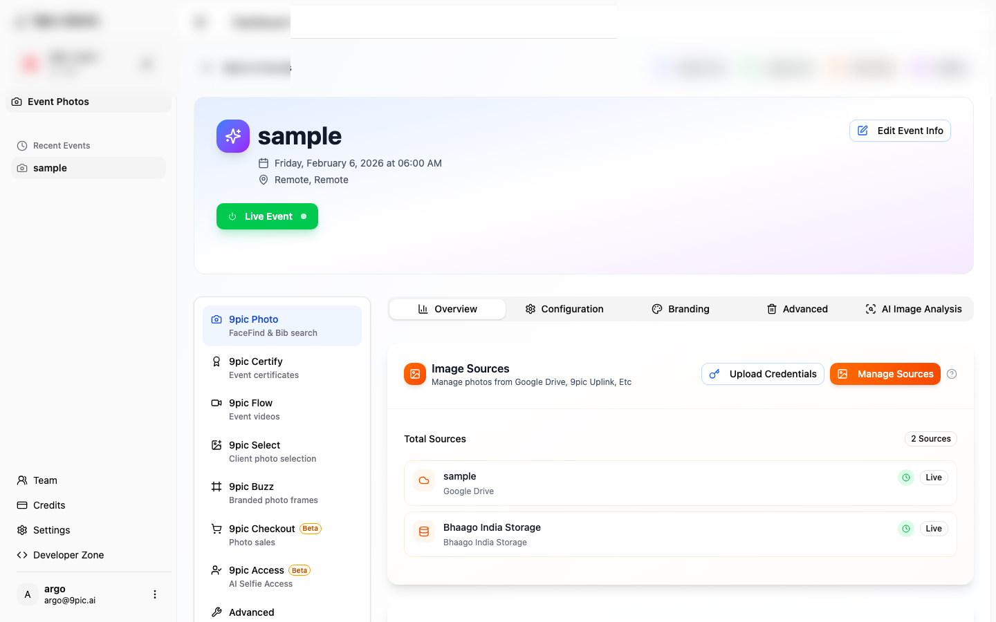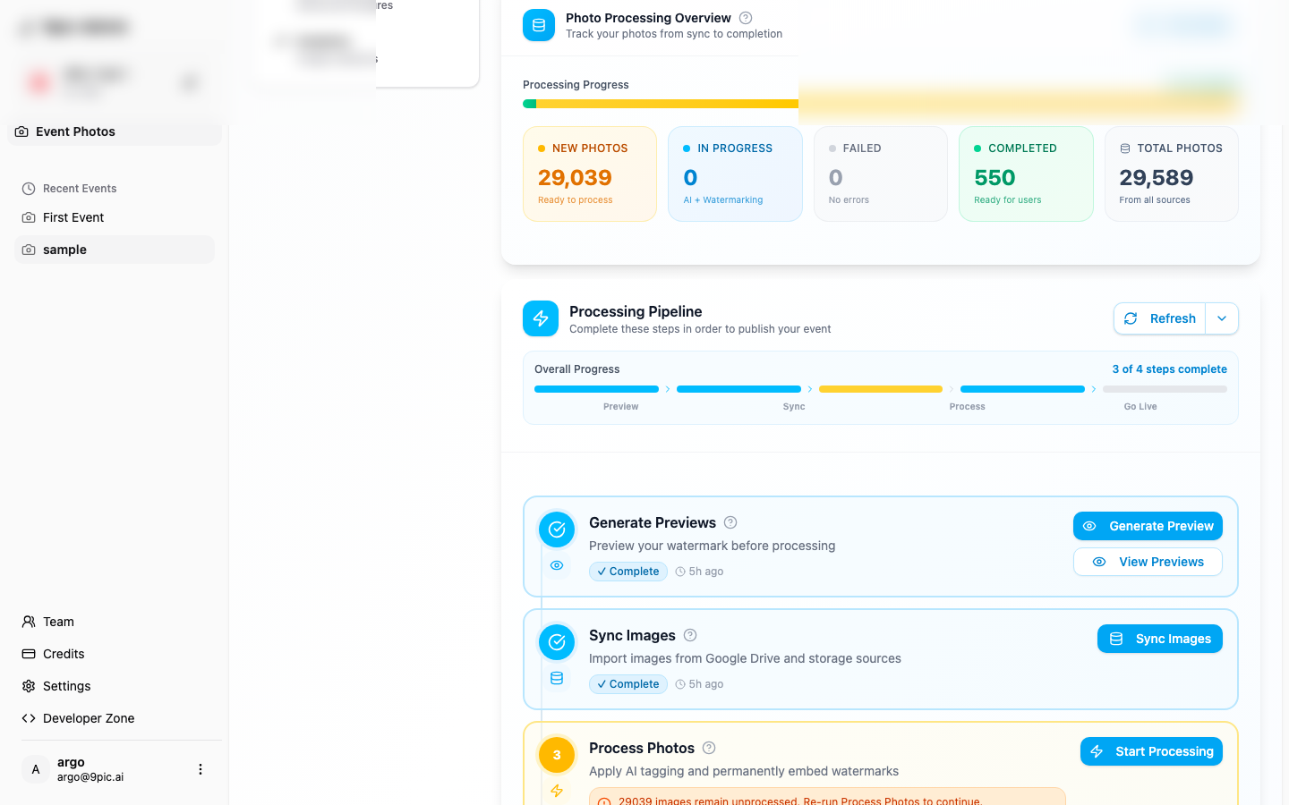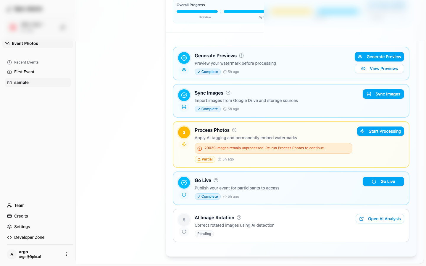 The Photos Overview tab is the control center for your event’s photo lifecycle. You will connect image sources, generate watermark previews, run AI processing, and publish the event so participants can search and download photos.